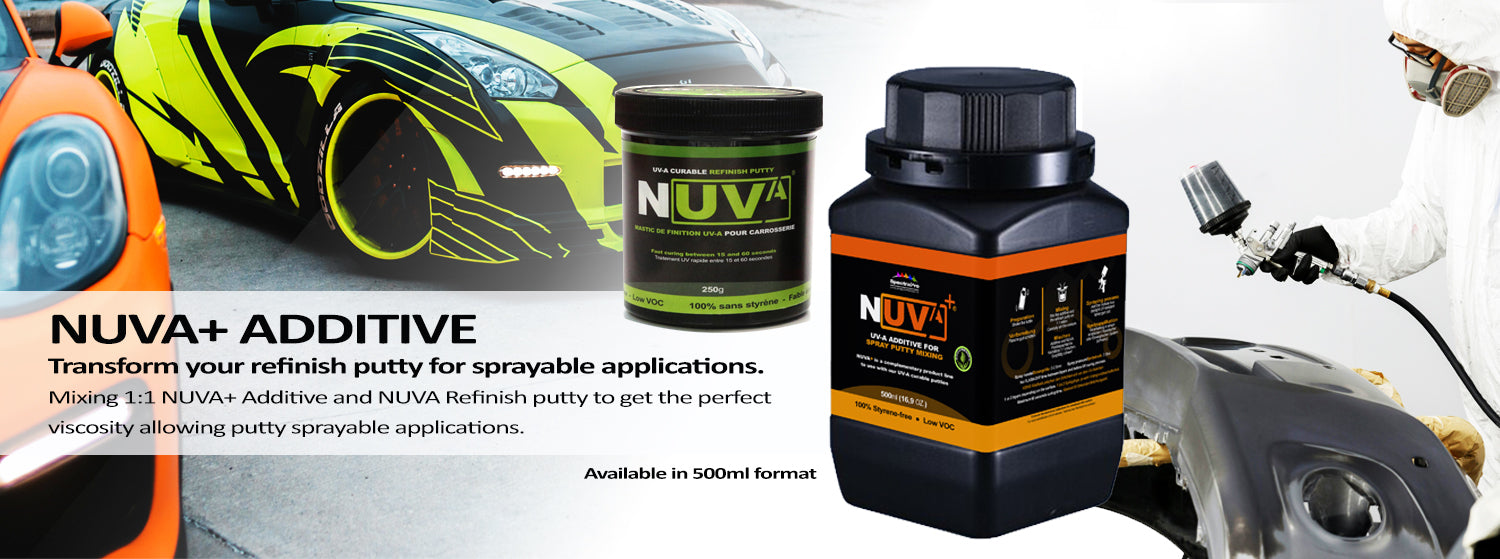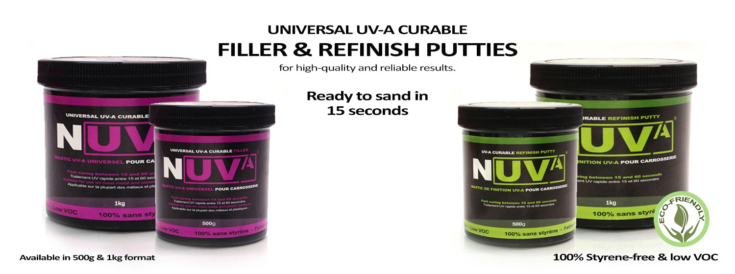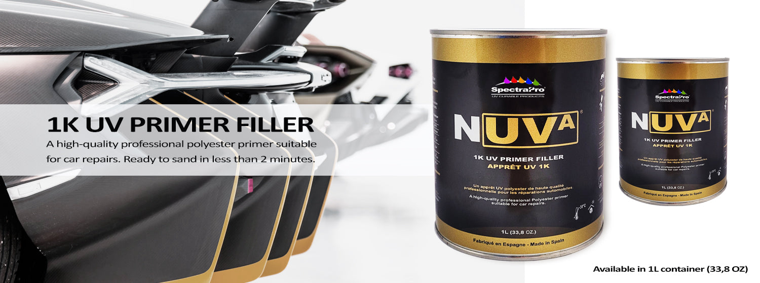 NUVA is a professional product line specially designed for automotive refinishing and globally distributed by SpectraPro. Developed and tested by experts for optimal quality results, the product line includes the universal UV-A curable filler and refinish putty.